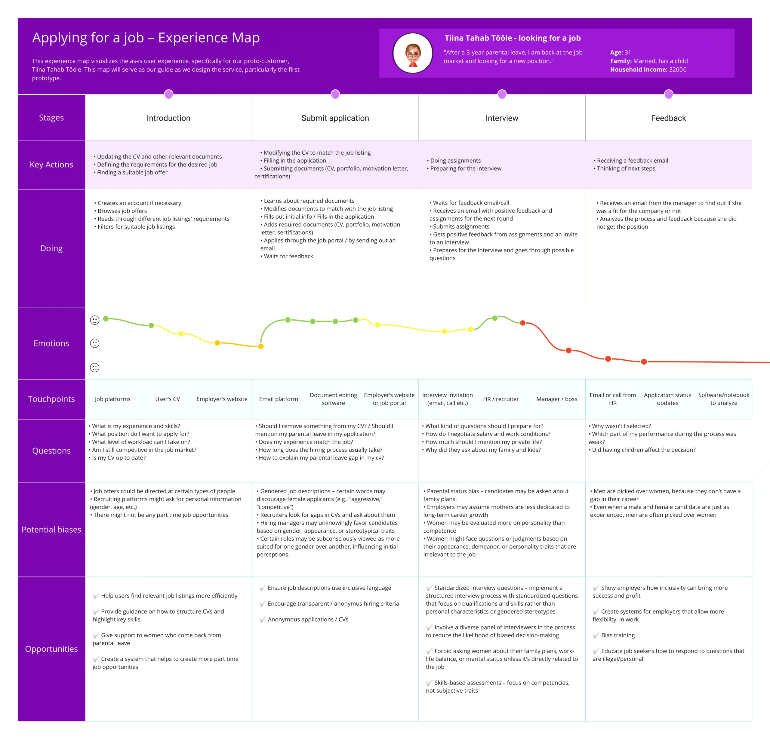The experience map illustrates the job application process from the perspective of a mother of a young child returning to the job market after parental leave.